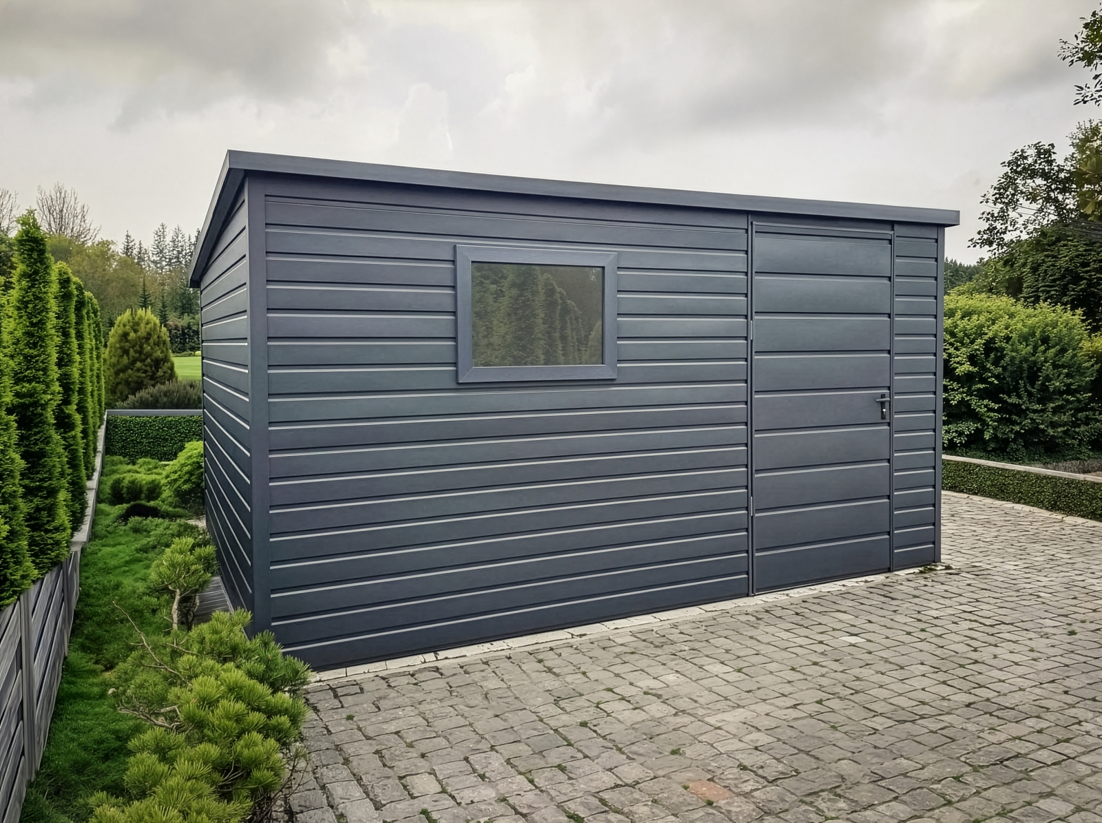 Nowoczesny wygląd i neutralna kolorystyka sprawiają, że domek narzędziowy doskonale komponuje się zarówno z tradycyjnymi, jak i nowoczesnymi ogrodami. To nie tylko funkcjonalne, ale także dekoracyjne rozwiązanie.